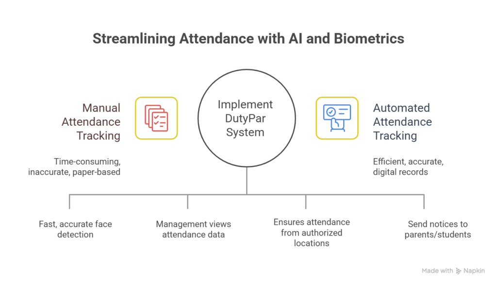 DutyPar focuses on face-based AI attendance designed for teachers, students, and staff. It allows:
