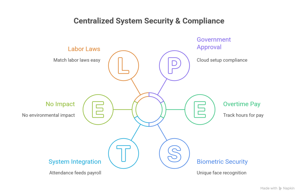 Data sits safe in one spot. Encrypt it end-to-end. Role-based access keeps it tight. HR sees all. Staff sees own. Labor laws match easy. Track hours for overtime pay. Audit trails log changes. Governments approve cloud setups. ISO standards add trust. Breaches rare with biometrics. No shared cards. Faces unique. Schools stay compliant for grants. Businesses avoid fines.