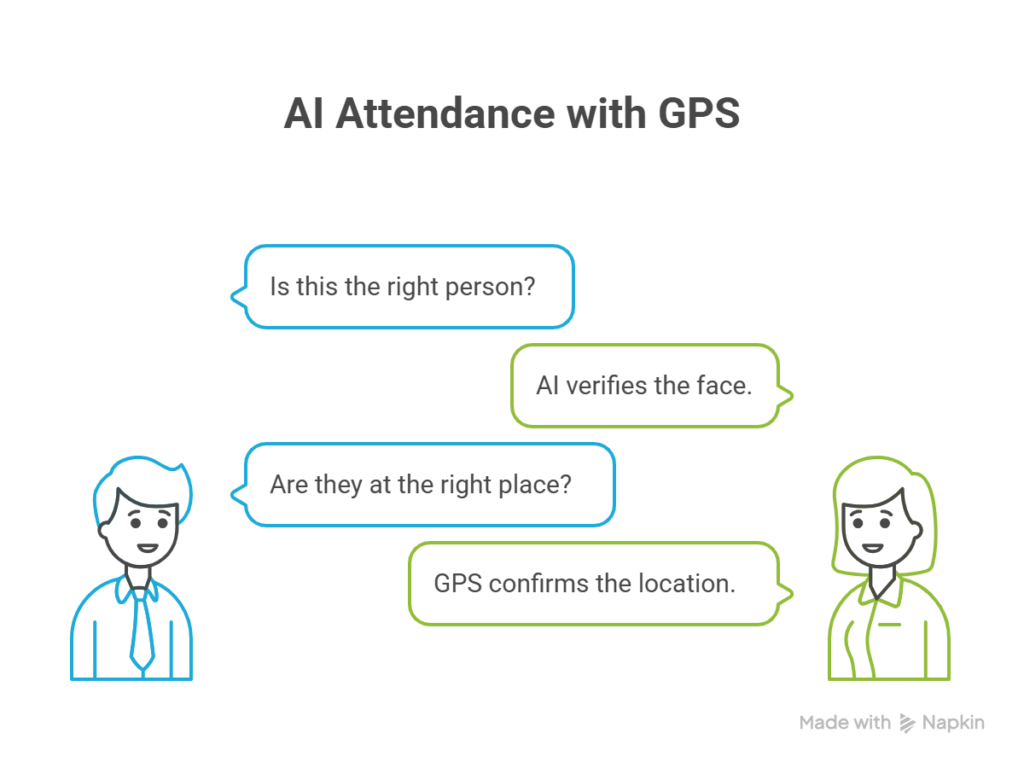 When AI is added, AI attendance can also verify who is marking attendance, while GPS confirms where they are.